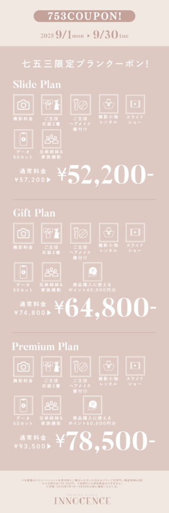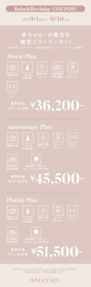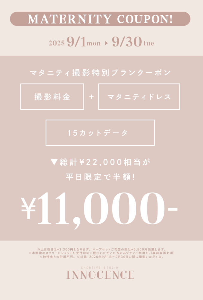 #マタニティ #七五三 #ハーフバースデー・お誕生日 #赤ちゃん 2025.08.22 【ALL EVENT】INNOCENCE 9月限定クーポン! ❖❖❖ 赤ちゃん・お誕生日撮影キャンペーン ❖❖❖ ❖❖❖ 七五三撮影キャンペーン ❖❖❖ ❖❖❖ マタニティ撮影キャンペーン ❖❖❖ 一覧に戻る