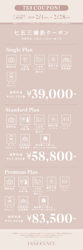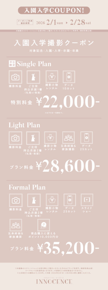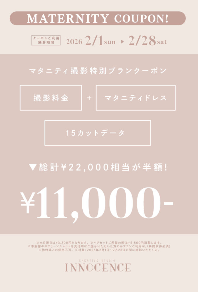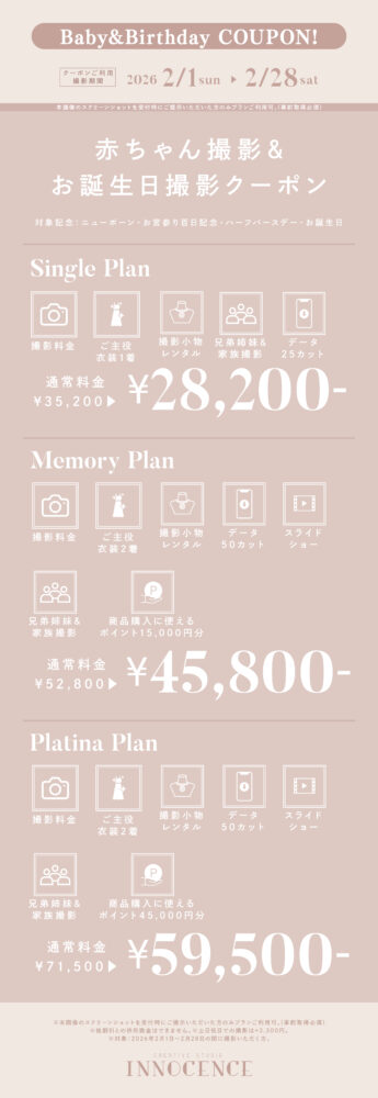 #1/2成人式 #マタニティ #七五三 #ハーフバースデー・お誕生日 #赤ちゃん #入園入学・卒園卒業 2026.01.23 【ALL EVENT】INNOCENCE 2月限定クーポン! ❖❖❖ 赤ちゃん・お誕生日撮影クーポン ❖❖❖ ❖❖❖ 七五三撮影クーポン ❖❖❖ ❖❖❖ 入園入学撮影クーポン ❖❖❖ ❖❖❖ マタニティ撮影クーポン ❖❖❖ 一覧に戻る